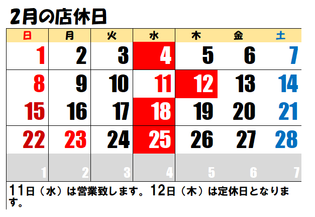 2/11(水)が営業で2/12(木)が定休日になりますのでご注意ください。