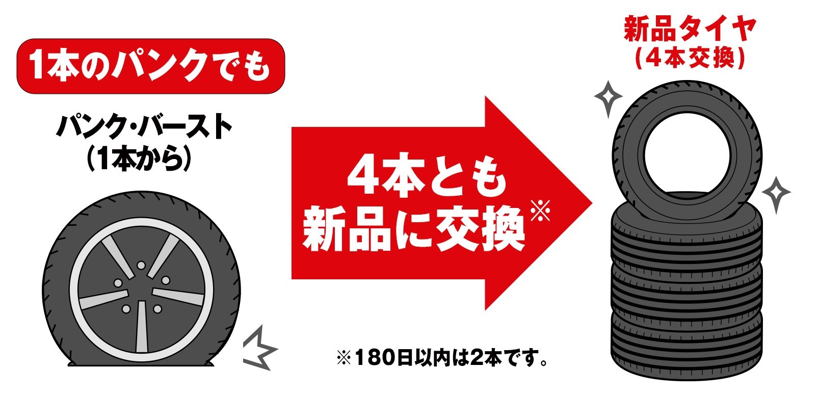 1本のパンクでも4本(180日以内は2本)すべてのタイヤを