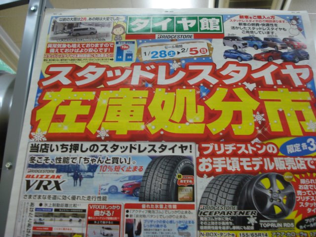 在庫処分市!!! ポスト 2017年1月29日 1/28(土)~2/5(日)の間でスタッドレスタイヤ在庫処分市を開催中でございます!!!スタッドレスタイヤをお求めやすい価格で販売中でございます!!!是非この機会にスタッドレスタイヤを購入して、もしもの時の雪に備え、安全安心に過ごしませんか? 担当:ヨシナリ