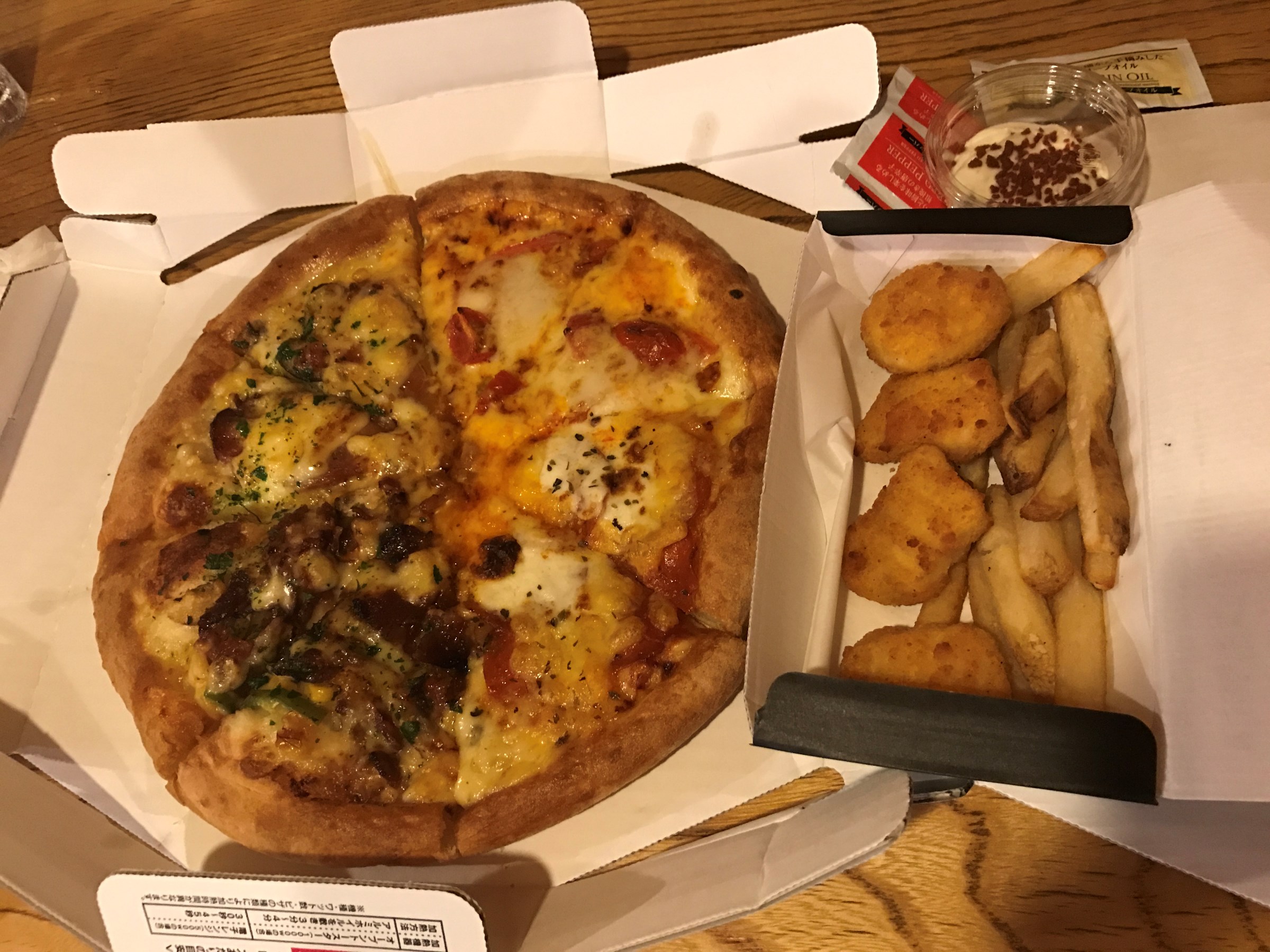 ホールピザ、ナゲット&ポテト、アイスと豪華なメニューを用意していただいてとても