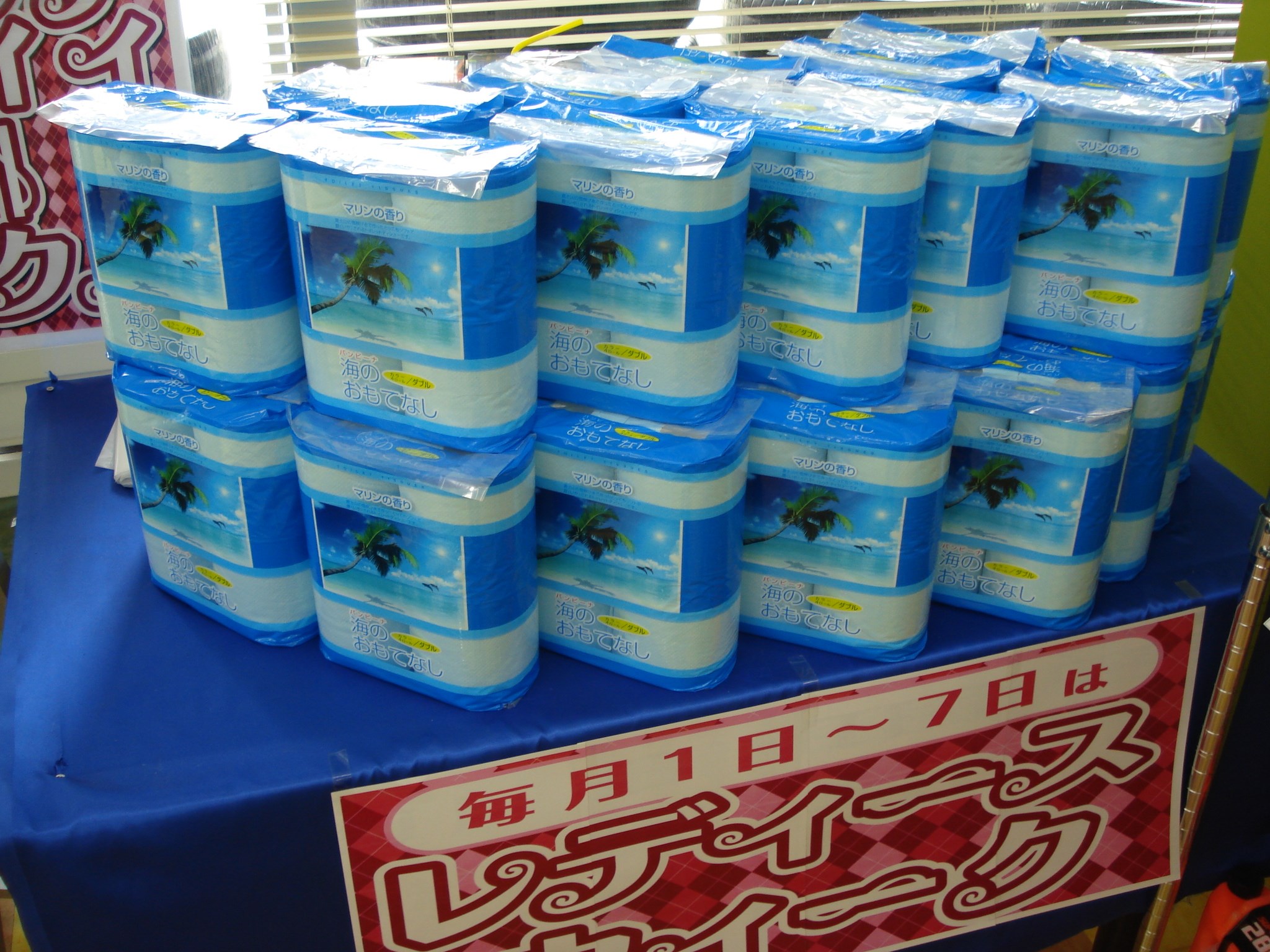 ★今月のレディースウィークは・・・ ポスト 2018年8月2日 今月のレディースウィークのプレゼントを紹介しま~す。 トイレットペーパーです。 いい香りがします(^^) レディースウィークは 毎月1日~7日にご来店、ご購入された 女性のお客様にプレゼントしております。 数に限りがありますのでお早目にどうぞ!! 担当:こばやし