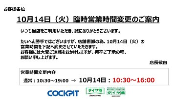 タイヤ館ひたち多賀店のWEBをご覧ご頂きありがとうございます! 10月14日、棚卸しの為、営業時間が変更になります。 開店 10:30 〜 閉店 16:00(作業最終受付15:00) ご迷惑をお掛け致しまして申し訳ございません。 16日(木)より通常営業いたしますので、皆様のご来店 お待ちしております\( ˆoˆ )/ ...