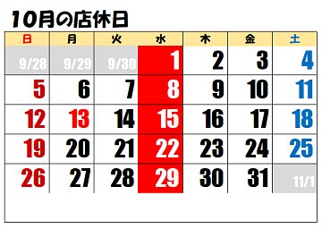 10月定休日・10/14(火)営業時間変更のお知らせ