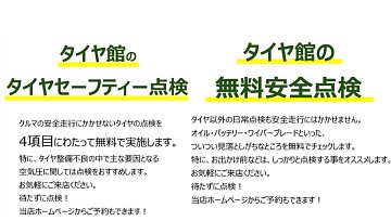タイヤ館ひたち多賀店のHPをご覧いただきありがとうございます! 気温も上がり、過ごしにくい日が続いていますが夏は沢山の イベントがあります!外出される方も多いのではないでしょうか!? 安全に走行していただく為にもタイヤ館ではお車の点検を無料で 行なっています! タイヤ点検について詳し...