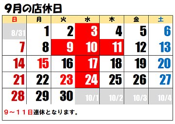 タイヤ館ひたち多賀店のWEBをご覧いただき ありがとうございます! 9月の定休日は3・9・10・11・17・24日になります。 9〜11日は連休となります。 ご迷惑をお掛けし申し訳ございません。 開店:10時30分~ 受付:18時30分まで 閉店:19時00分