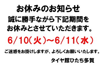 タイヤ館ひたち多賀のHPをご覧いただきありがとうございます。 お知らせになります。 6/10(火)・11(水)はお休みになります。 ご迷惑をおかけ致しますがご理解ご協力の程 よろしくお願い致します。