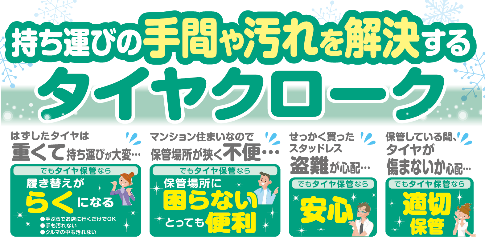 皆様、スタッドレスタイヤ(夏用タイヤ)の保管にお困りではないでしょうか?? 当店では『タイヤクロークサービス』を行っています。 季節ごとにタイヤを専用の倉庫にてお預りするサービスになります。 ①タイヤを置く場所がない ②タイヤを運ぶのが重くて大変 ③タイヤが大きくて車内に積んでこれな...