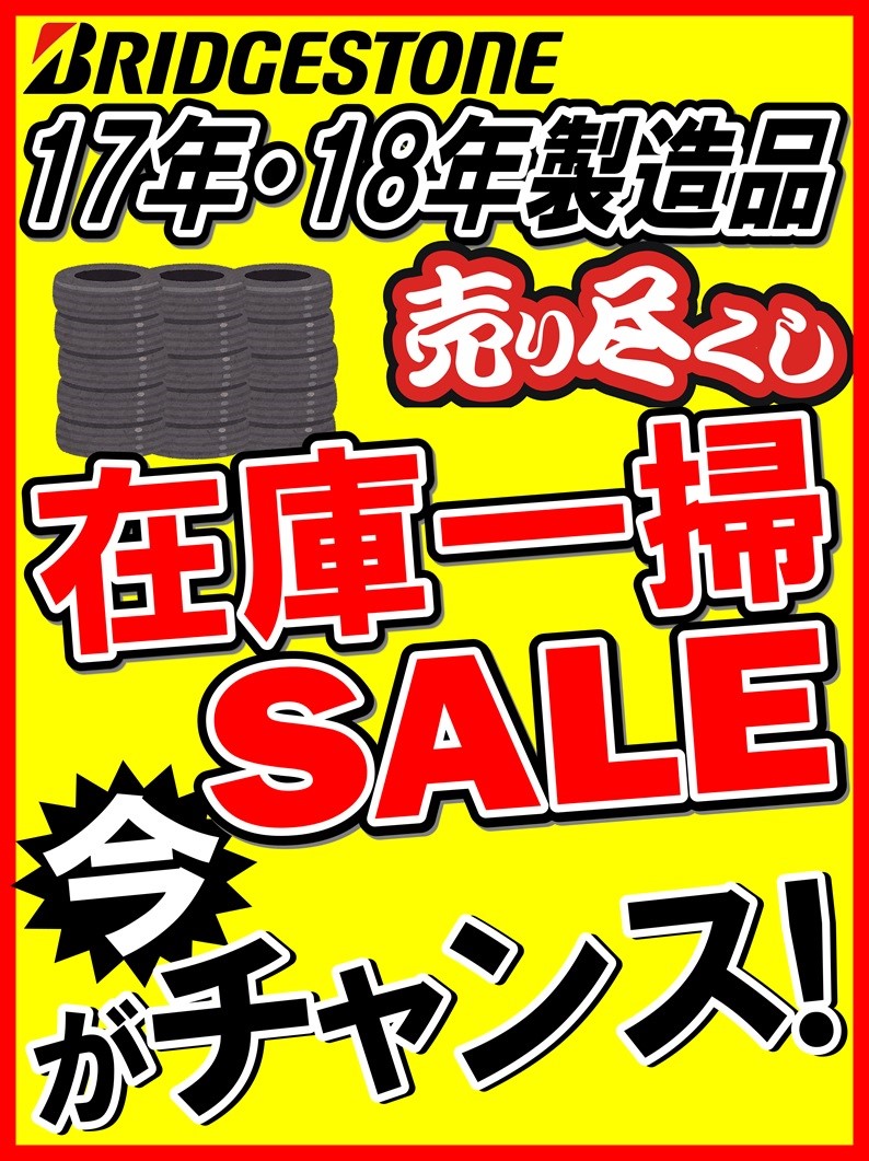 夏用タイヤ【在庫一掃SALE】 ポスト 2021年1月17日 まだ、スタッドレスタイヤを装着していると思いますが、 当店では、夏用タイヤ【在庫一掃セール】を開催致します! 17年・18年製造品でお買い得価格にて販売致します! 現品限りになりますので、春先に履き替えと一緒にお考えのお客様は 早めの準備として、ご検討下さい!