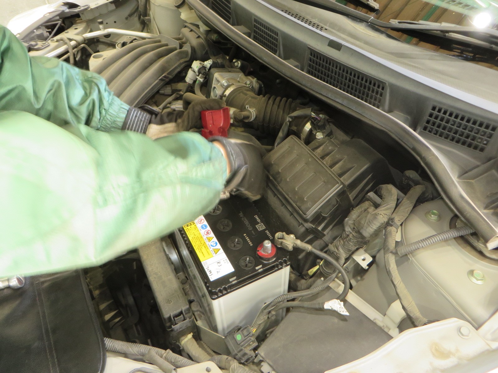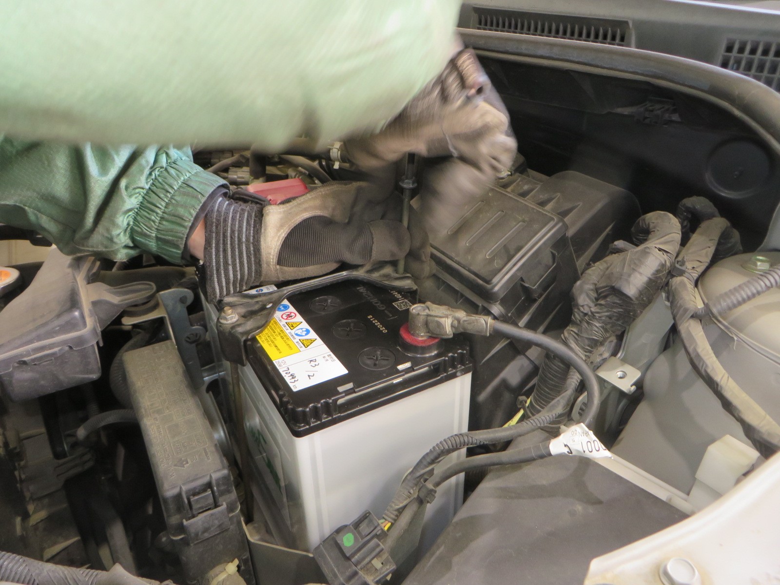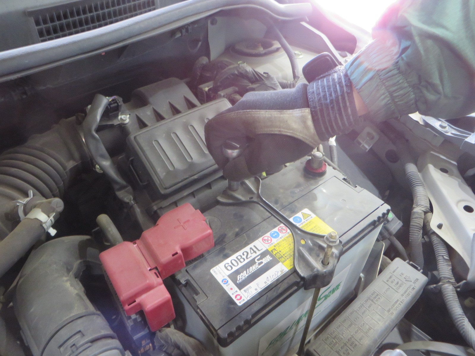 端子を外しますが取り外す際は"-端子"から外します。外す際にボディ等の金属部に工具が