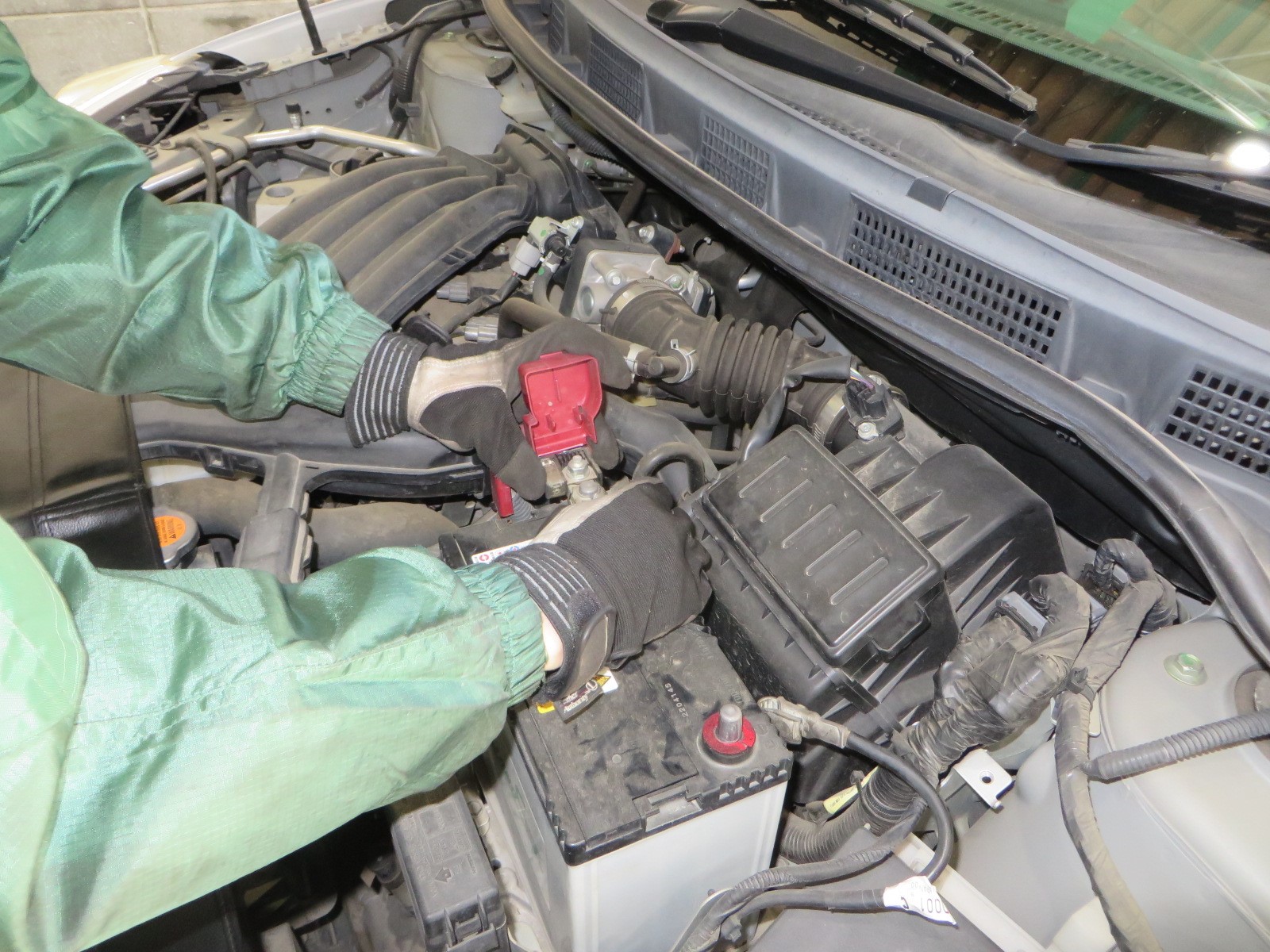 接触しないよう気を付けながら行っていきます。次に"+端子"を外します。