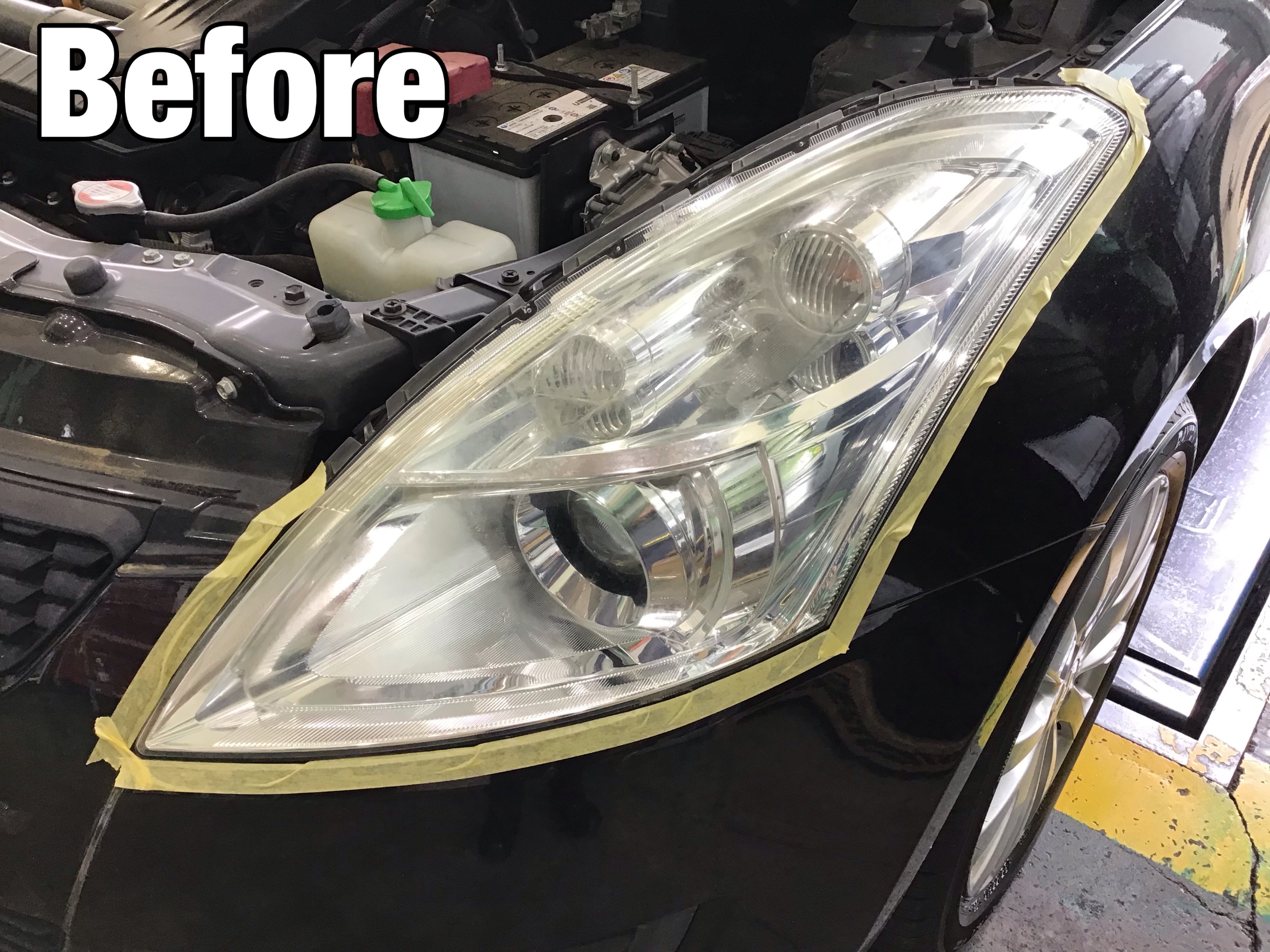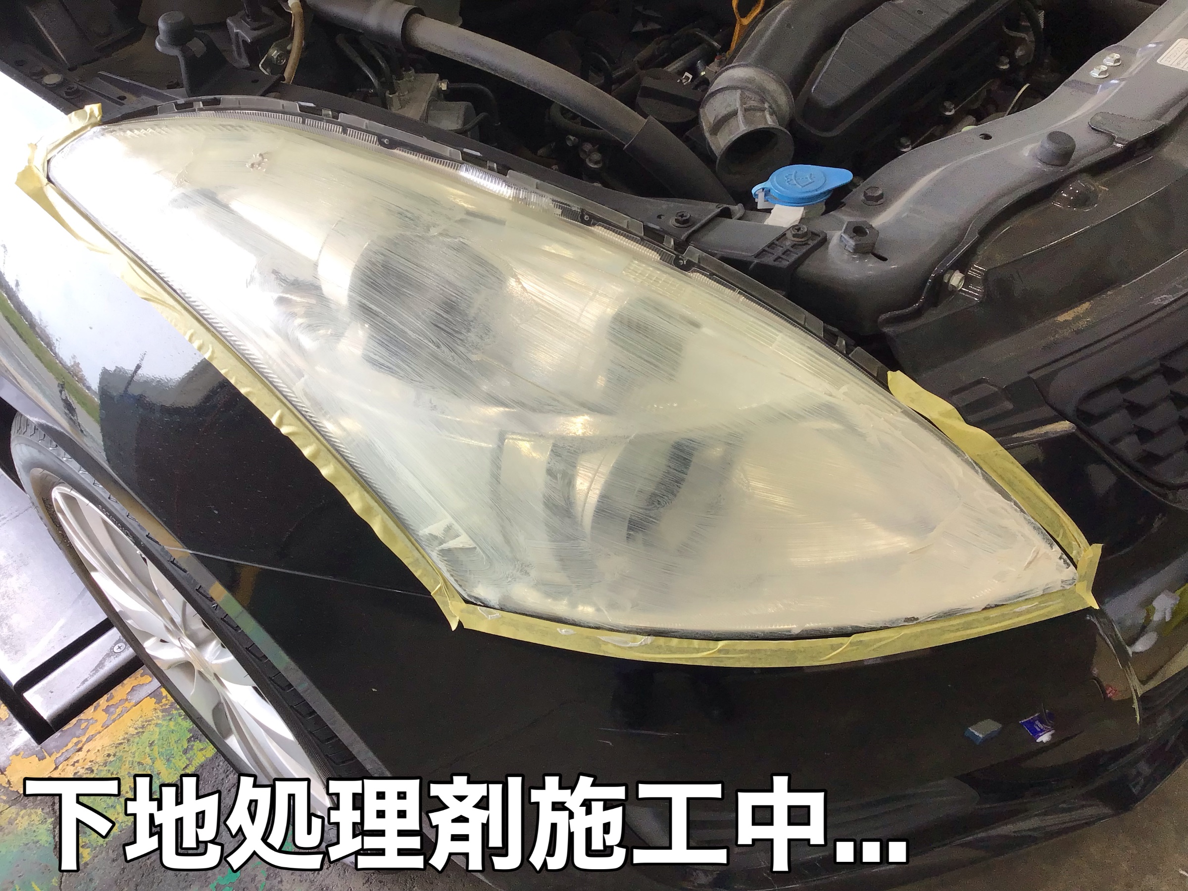 早速作業ですが、まずライト周りの汚れや傷等防止のためのマスキングテープを貼ります。