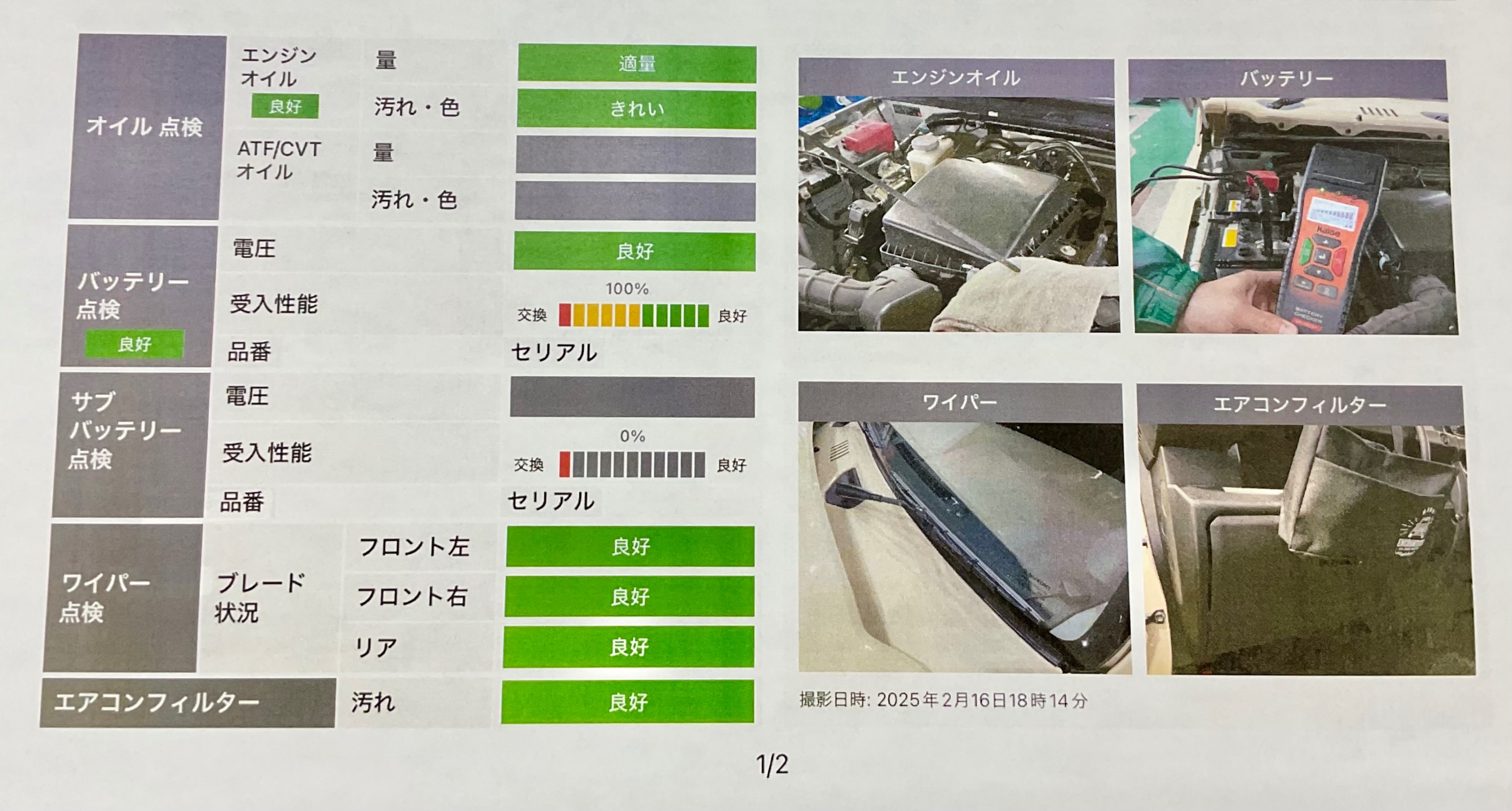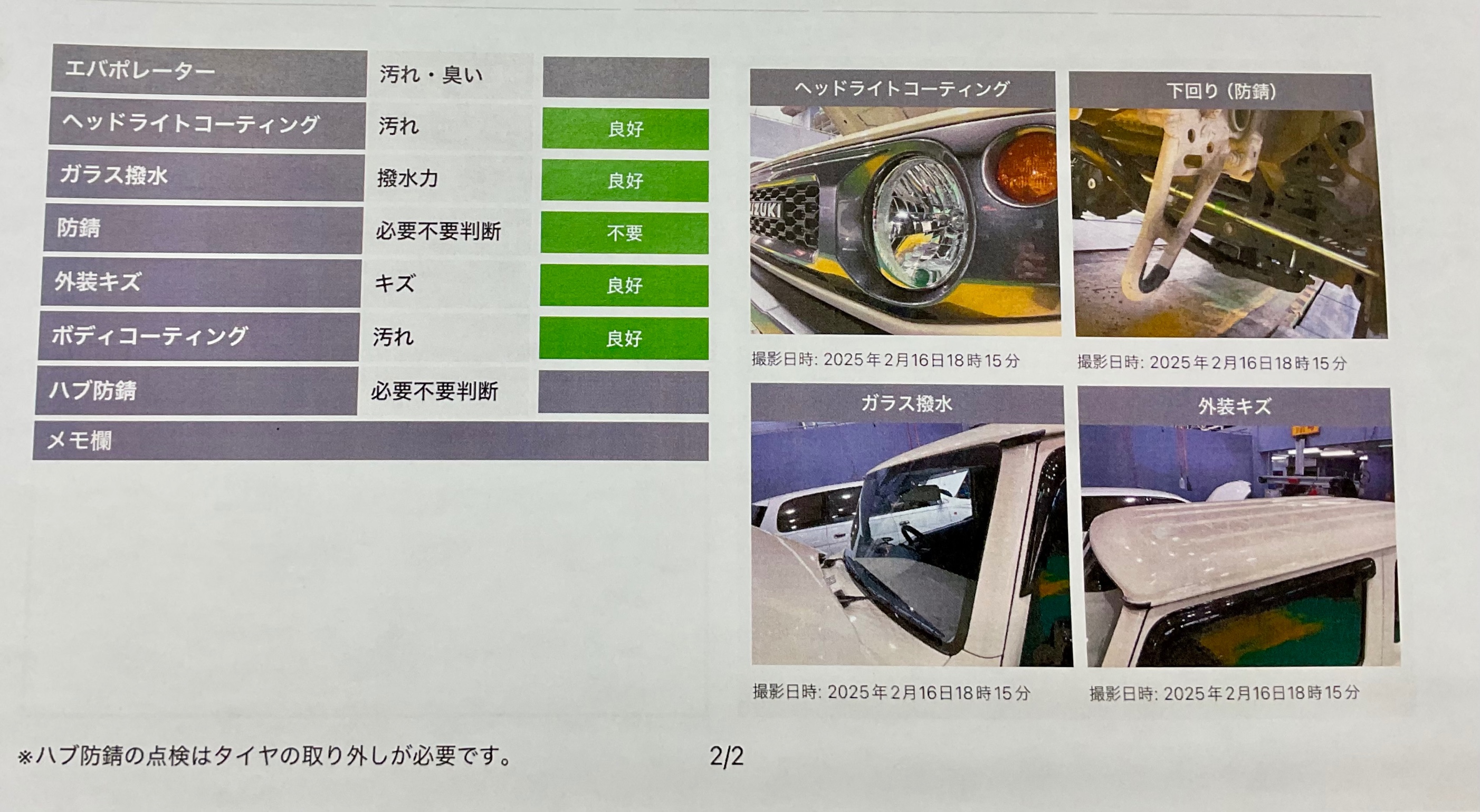 項目はエンジンオイル、バッテリー、ワイパー、エアコンフィルター、ヘッドライト、下回り、ガラス撥水、外装キズになります。