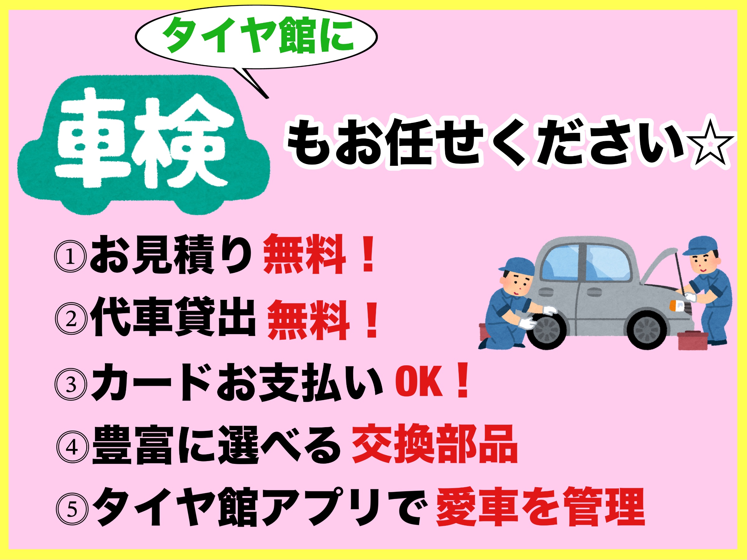 タイヤ館・点検・タイヤ交換・脱着・エンジンオイル交換・バッテリー交換・安い・パンク・エアコンフィルター・ワイパー交換・エアコン添加剤・エアコン洗浄・ワコーズ・WAKOS・パワーエアコン・ヘッドライトコーティング・窒素ガス・空気圧点検・アライメント調整・ブリヂストン・ブリジストン・BS・レグノ・BRIDGESTONE・REGNO・POTENZA・PLAYZ・ECOPIA・NEXTRY・BLIZZAK・マルチウエザー・オールシーズンタイヤ・プレイズ・エコピア・ネクストリー・ニューノ・ポテンザ・デューラー・アレンザ・商用車タイヤ・軽トラ・ハイエース・ブリザック・ATF交換・CVT・オイルフィルター・車内消臭・安いタイヤ・デイトン・DAYTON・セイバーリング・ガラスコーティング・ボディーコーティング・カーコーティング・フッソ・カーフィルム・樹脂パーツコーティング・防錆コーティング・錆止め・オイル交換安い・カーフィルム・ガラス修理・ウインドウリペア・ニューテック・R254・R407・TEIN・テイン・RS-R・タナベ・HKS・トラスト・アペックス・サード・ブリッツ・TRD・ニスモ・無限・STI・データシステム・RECARO・レカロ・PIVOT・ピボット・玄武・GENBU・ブリッド・BRIDE・クスコ・CUSCO・ベレッツァ・クラッチオ・柿本 改・カキモトレーシング・フジツボ・ユピテル・コムテック・ドライブレコーダー・TPMS・空気圧センサー・ユピテル・コムテック・ドライブレコーダー・パイオニア・パナソニック・バッテリー・カオス・GS