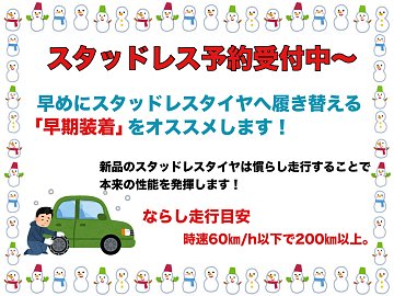 皆さまこんにちは・こんばんは٩(๑❛ᴗ❛๑)۶ いつもタイヤ館本庄店のWEBをご覧いただきありがとうございます。 また、早期装着する事で急な降雪でも慌てず安心・安全! (タイヤの摩耗は5000㎞の走行で約1㎜) 混雑時期を避けて待ち時間も少なくてスムーズに交換完了♫ 便利なWEBもご利用ください٩(๑❛ᴗ❛๑...