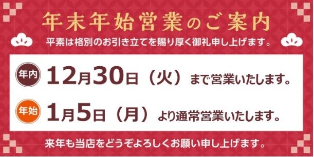 年末年始の営業日程のお知らせ 2025年12月28日 日頃から当店をご愛用頂き誠にありがとうございます。 年末年始の営業日についてご案内致します。 2025年 年末営業 12月30日(火) 19時00分迄 2025年12月31日(水)~2026年1月4日(日) 休業日 2026年 年始営業始め 1月5日(月) 10時30分より通常営業 何卒宜しくお願い致します。