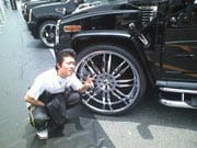 そして、30インチのホイールを履かせているハマーのH2を発見!!凄い迫力!思わず写真撮っちゃいました。鈴木がしゃがんで一緒に撮ったのですが、まぁデカイ事!!圧倒されました。(注 べつに鈴木が小さい訳ではありません。多分)