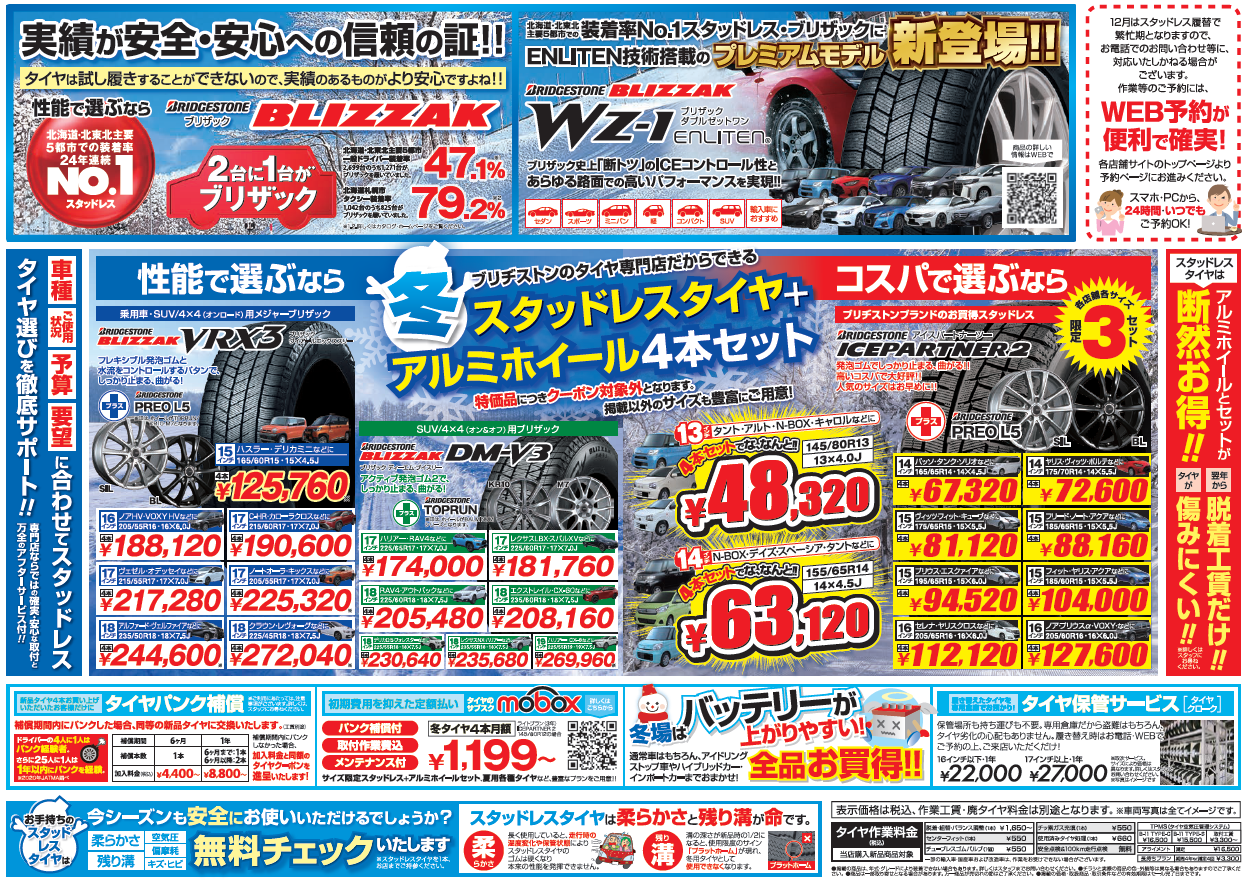 本日最終日【年末最後の売りつくし!】歳末タイヤ売り尽くしセール! ポスト 2025年12月27日 本日最終日です!! 25年最後のタイヤ売り尽くしセールを開催中!◇年末大感謝キャンペーン/12/4~28◇スーパータイヤセール12/4~21◇スペシャルプライスデー12/19~28どの期間もお客様にとっては非常にお買い得な12月になります!現在タイヤのご購入を検討されているお客様には朗報です!是非この機会に1度ご来店下さい!スタッフ一同お待ちしております!※繁忙期間につきご相談・ご来店はご予約が便利です! タイヤ館 茨木 住所:567-0865大阪府茨木市横江2-20-17 電話番号: 072-638-6889 相談予約 タイヤ点検・安全点検/タイヤ履き替え/オイル交換/その他ピット作業の予約