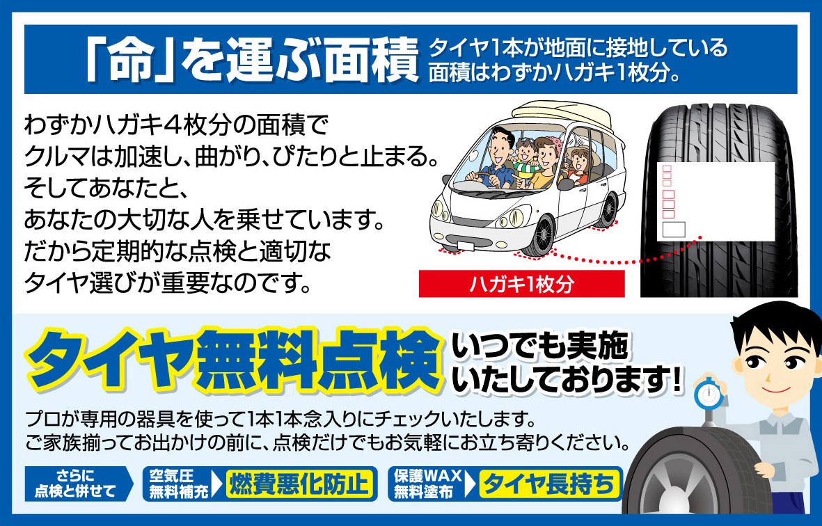 上記にもある通り、 僅かハガキ4枚分の面積しか地面と接地してないんですよねぇΣ(゚Д゚;o) 安心して乗って頂く為に、タイヤ館では「無料」で点検させて頂いてますっ!! 是非、一度お立ち寄り頂き、点検をお試し下さいねっ☆☆ さ、告知していた「ボーナス大商談会」もスタートしましたっ♪ 見るだけ...