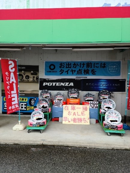 入口脇に“在庫一掃SALE”と銘打ち長期在庫になってしまったアルミホイールを