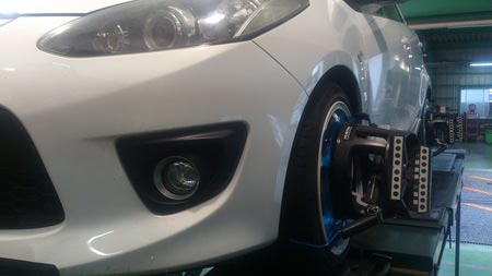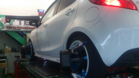 本日はマツダのデミオに車高調の取付とアライメント調整の