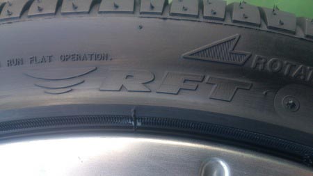 通常のタイヤと違い、タイヤの内側のサイド部に補強ゴムが追加されており