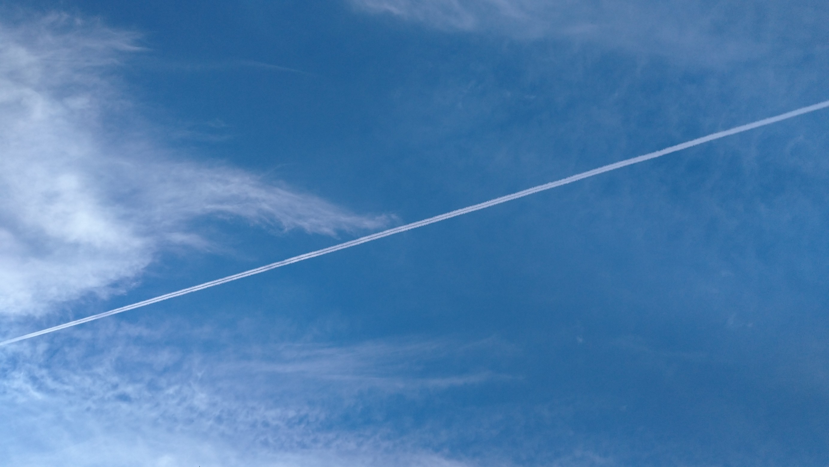 画像は、お店の2階の休憩室から見えた、青い空に綺麗な一本の飛行機雲