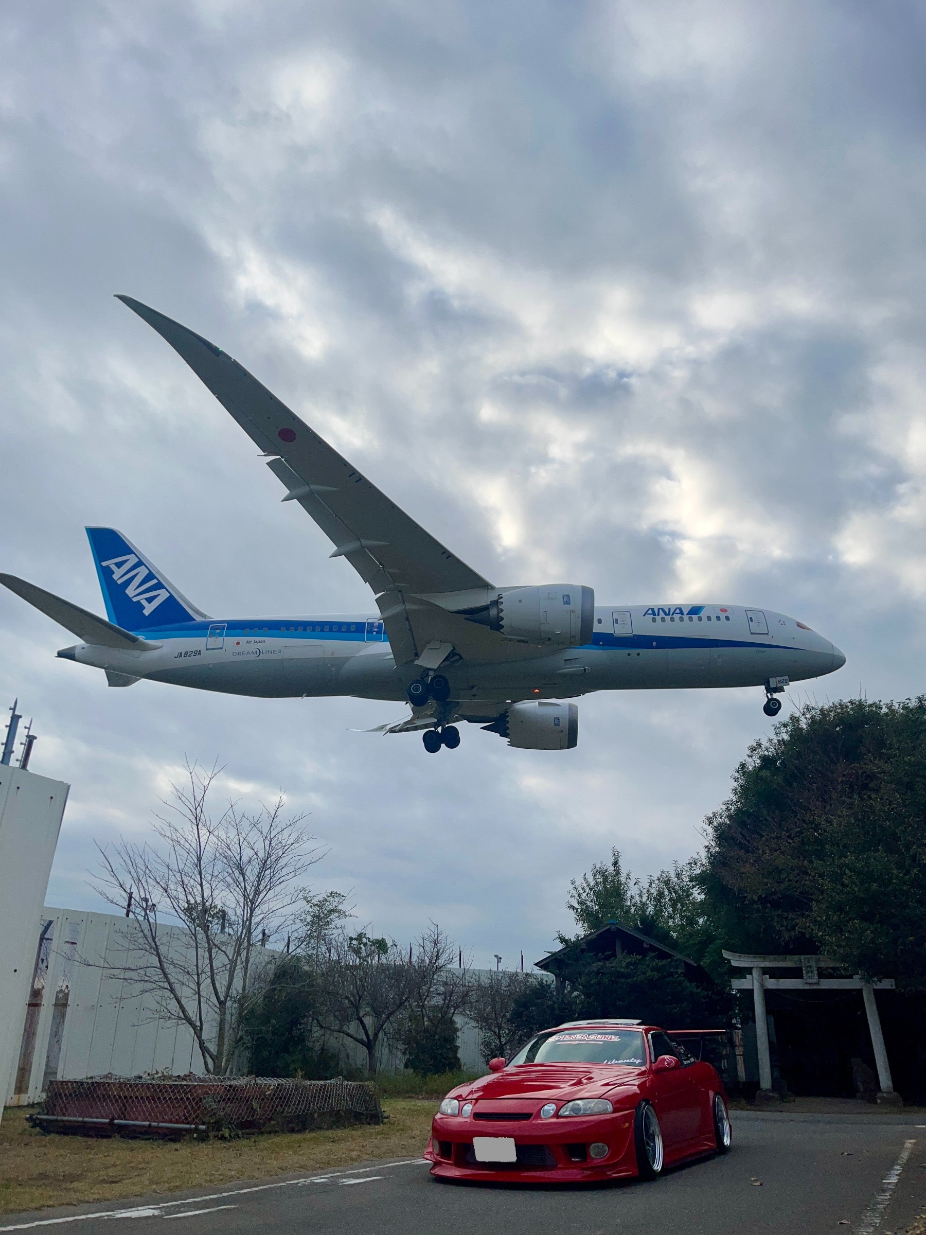 真っ赤なソアラと飛行機のコラボそして背景の神社イイですねぇ~