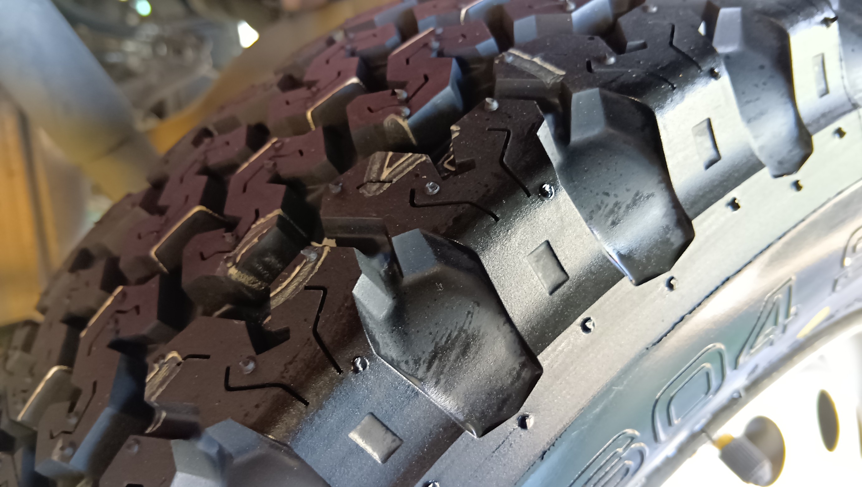 タイヤの溝は一般的なタイヤと違い、ブロックがボコボコしてます
