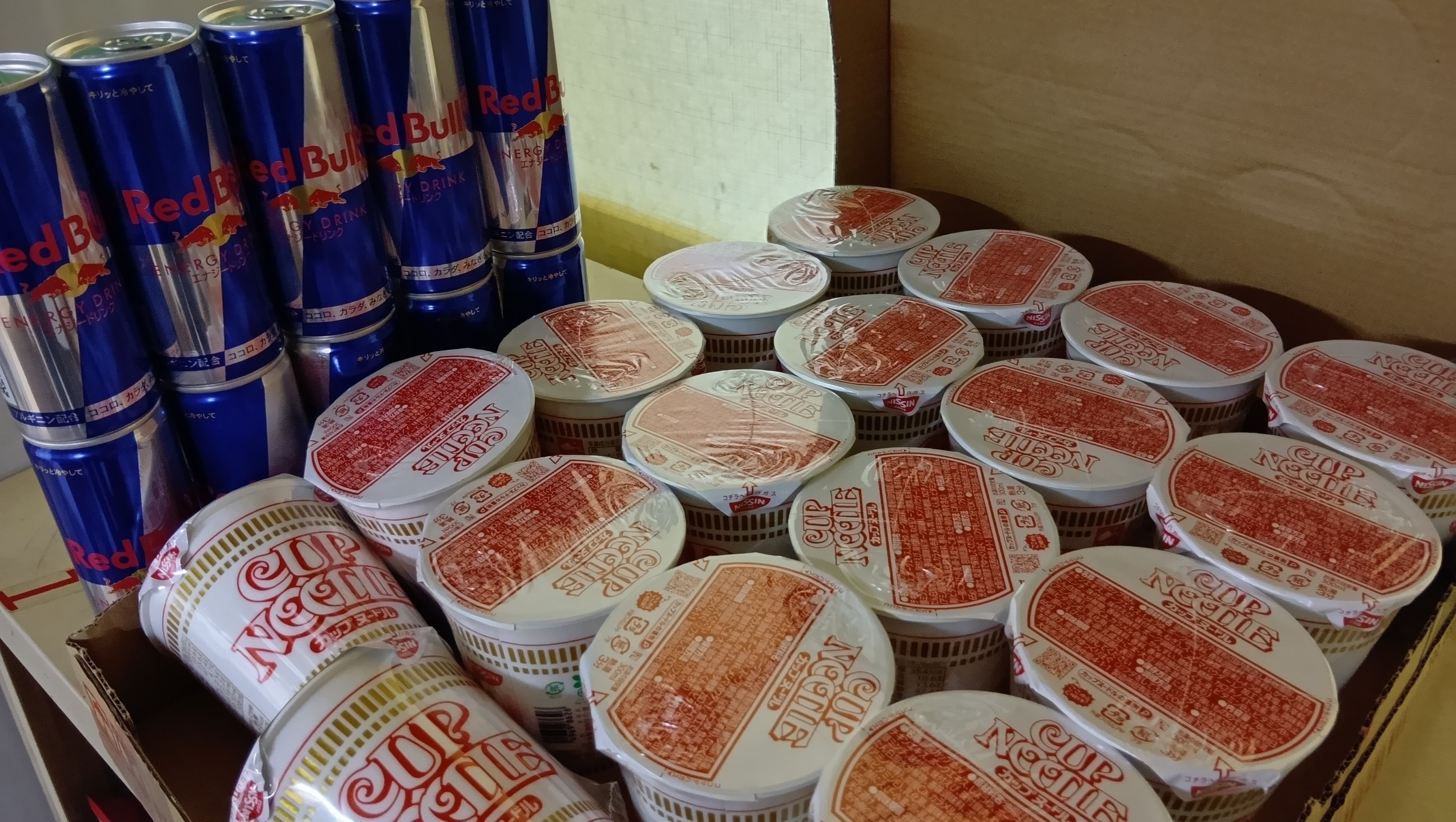 あと、今日あるメーカーさんからカップヌードルとエナジードリンクをいただきました
