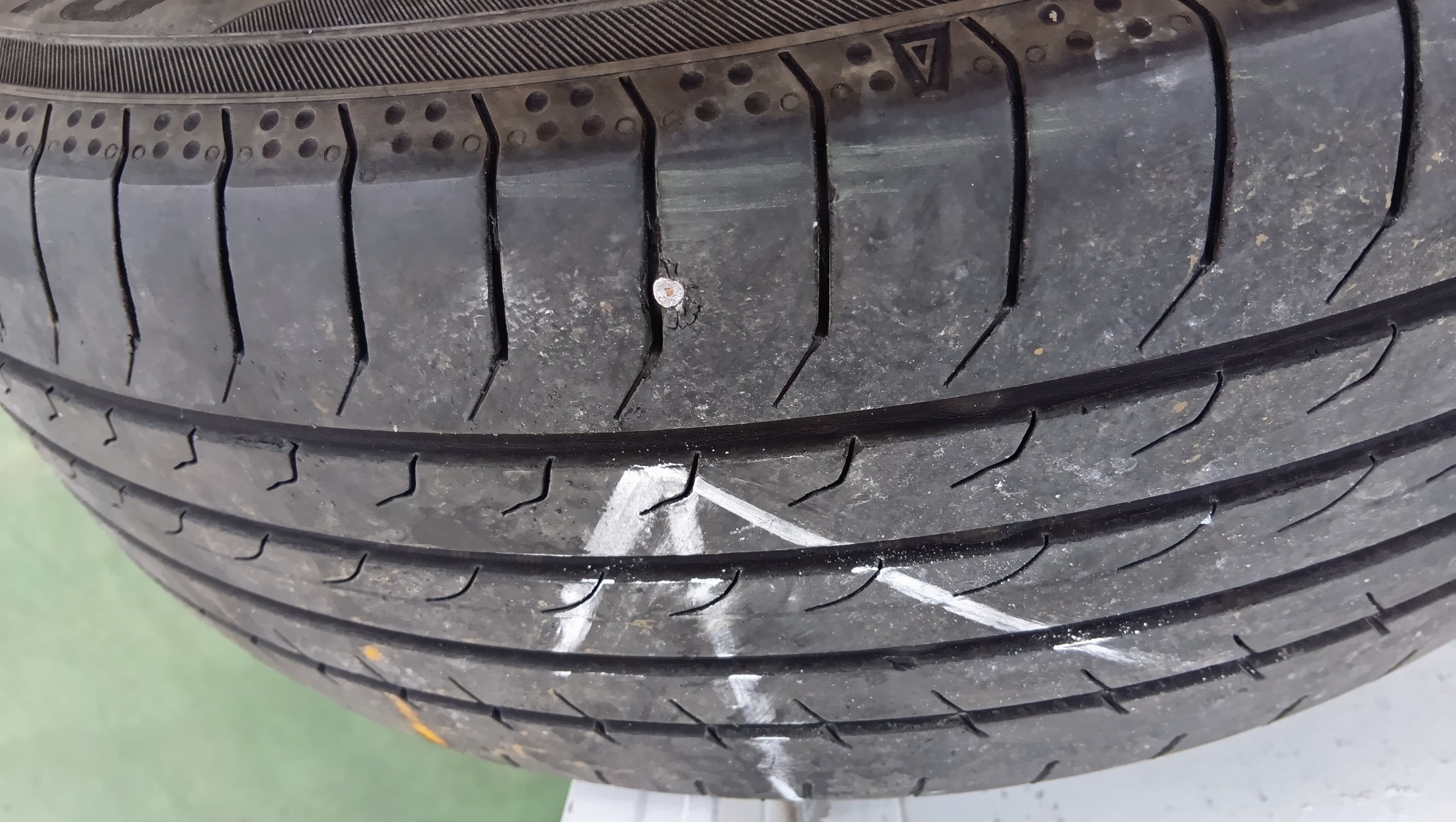 タイヤにクギみたいな物が刺さってるので見てほしいとご来店です