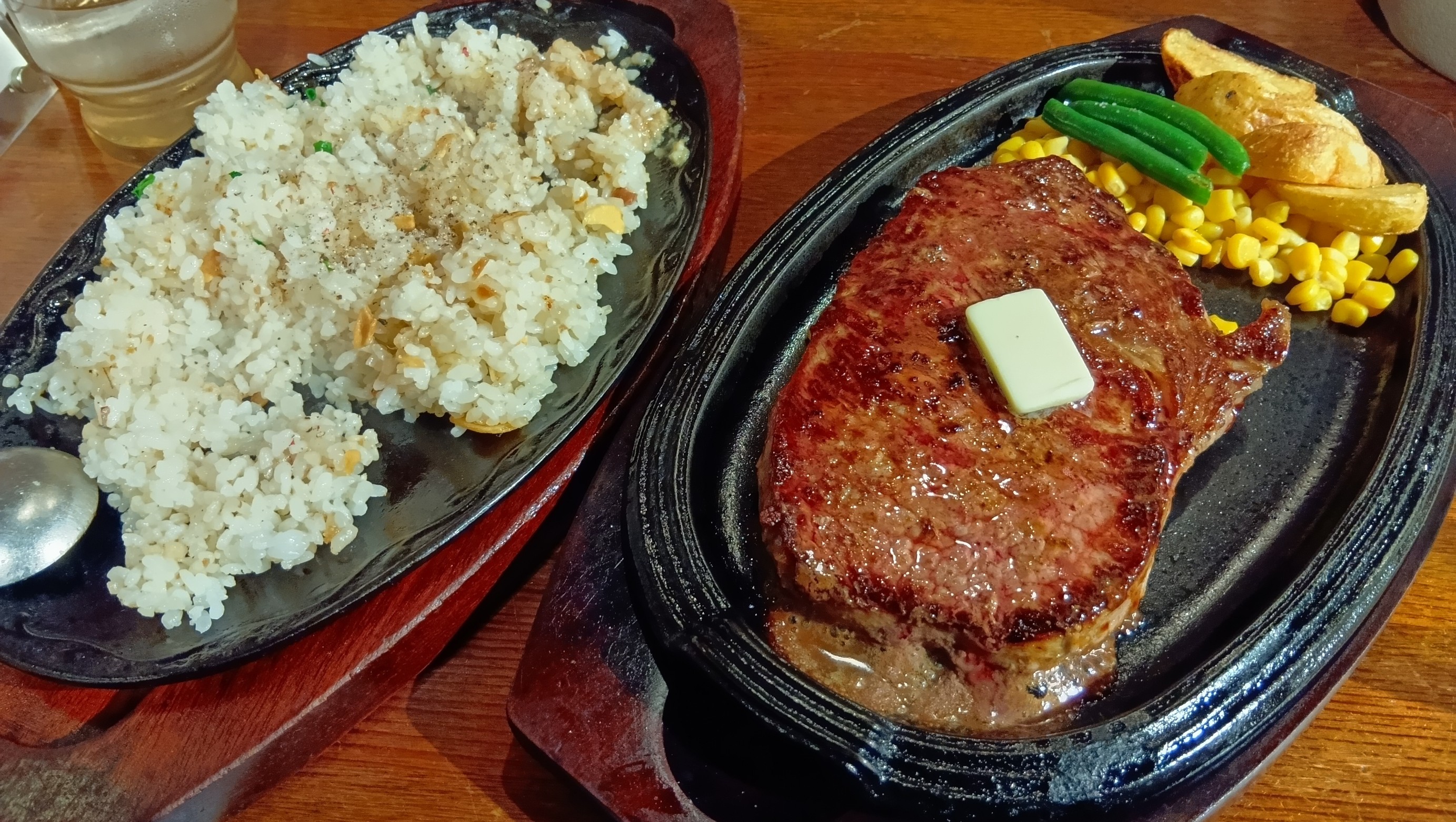 見てください!ガーリックライスにリブステーキです、美味しそうでしょう