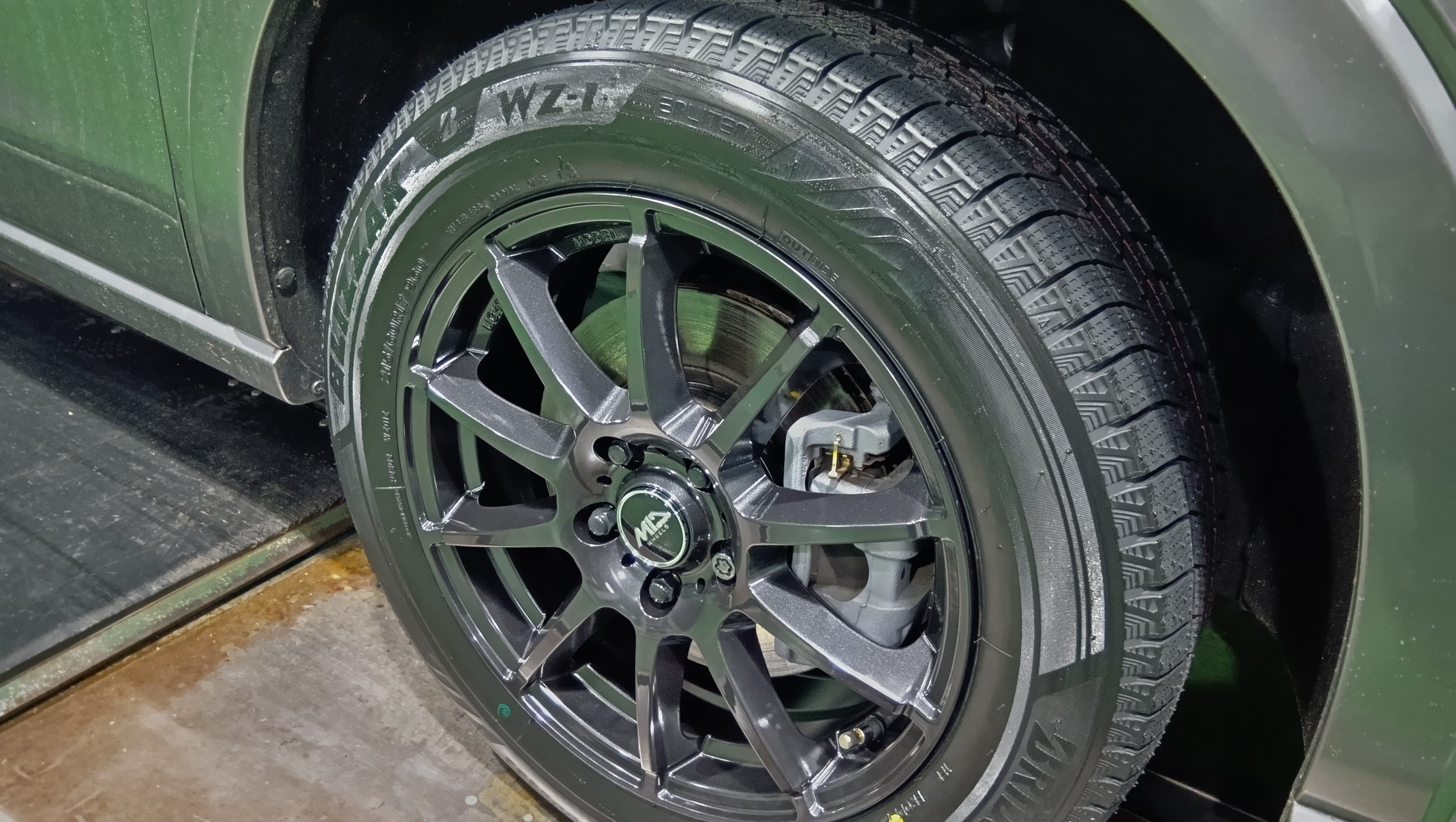 規定トルクで締め込み作業も修了、ホイールはブラックに見えますが