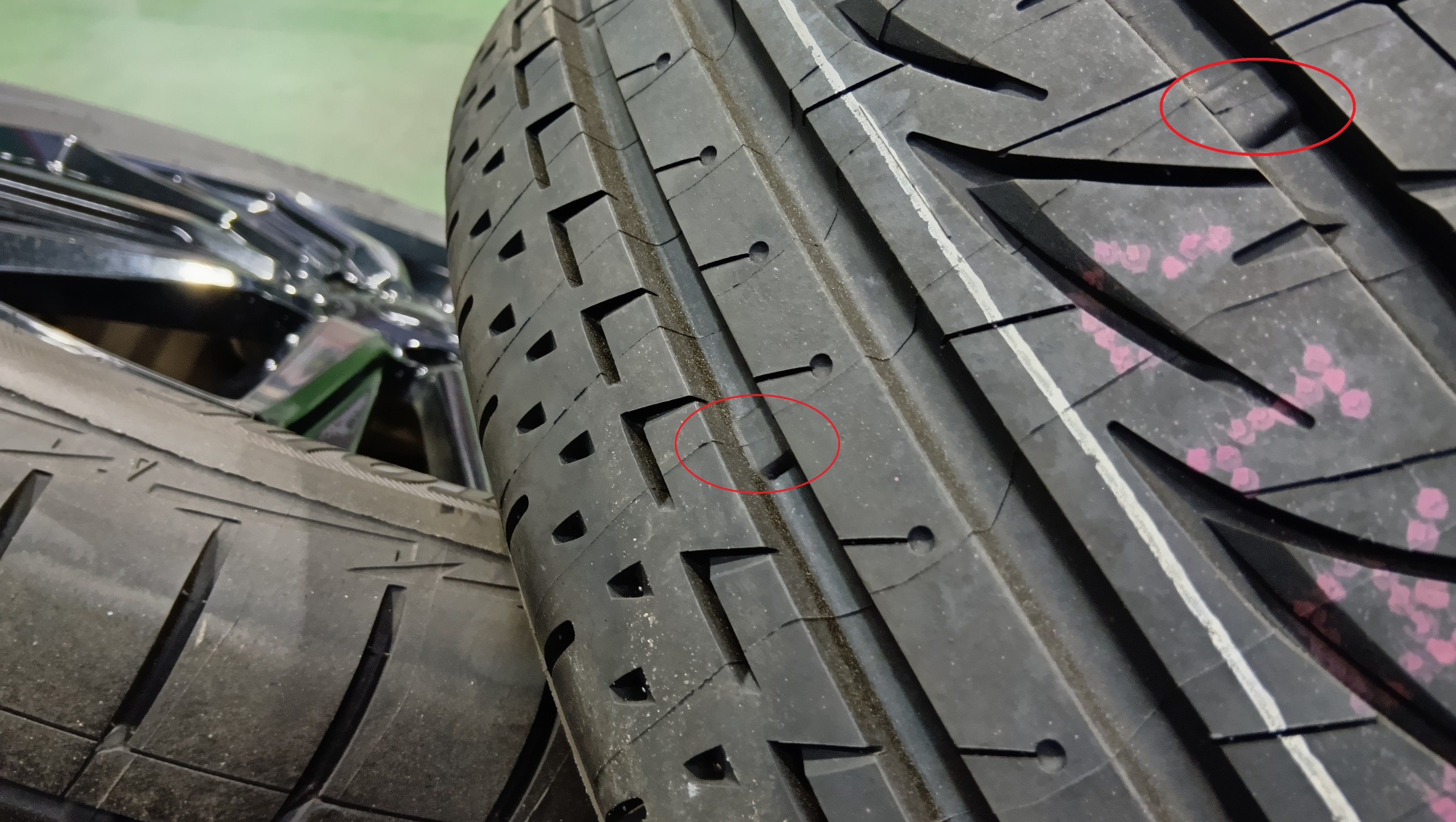 赤い〇の所がスリップサインです、内側に行くにつれスリップサインが露出してます