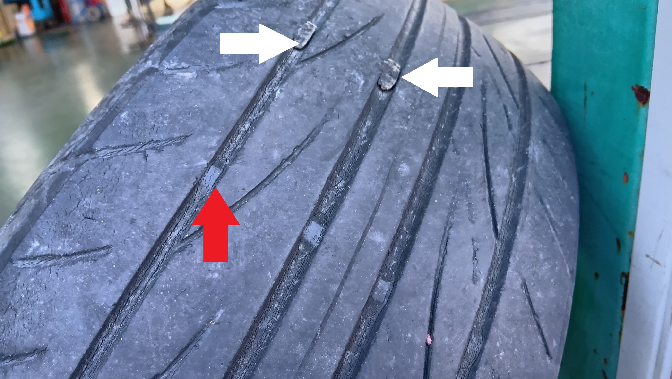 赤い矢印がスリップサインです、そして白い矢印がパンク修理の痕です