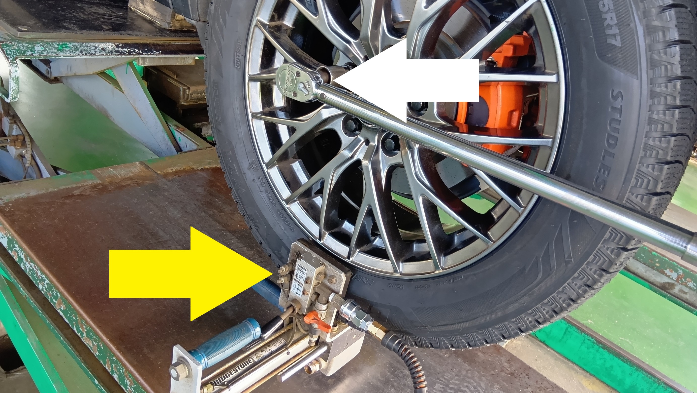 装置です、センターフィットを作動させたままトルクレンチ(白い矢印)で均等に
