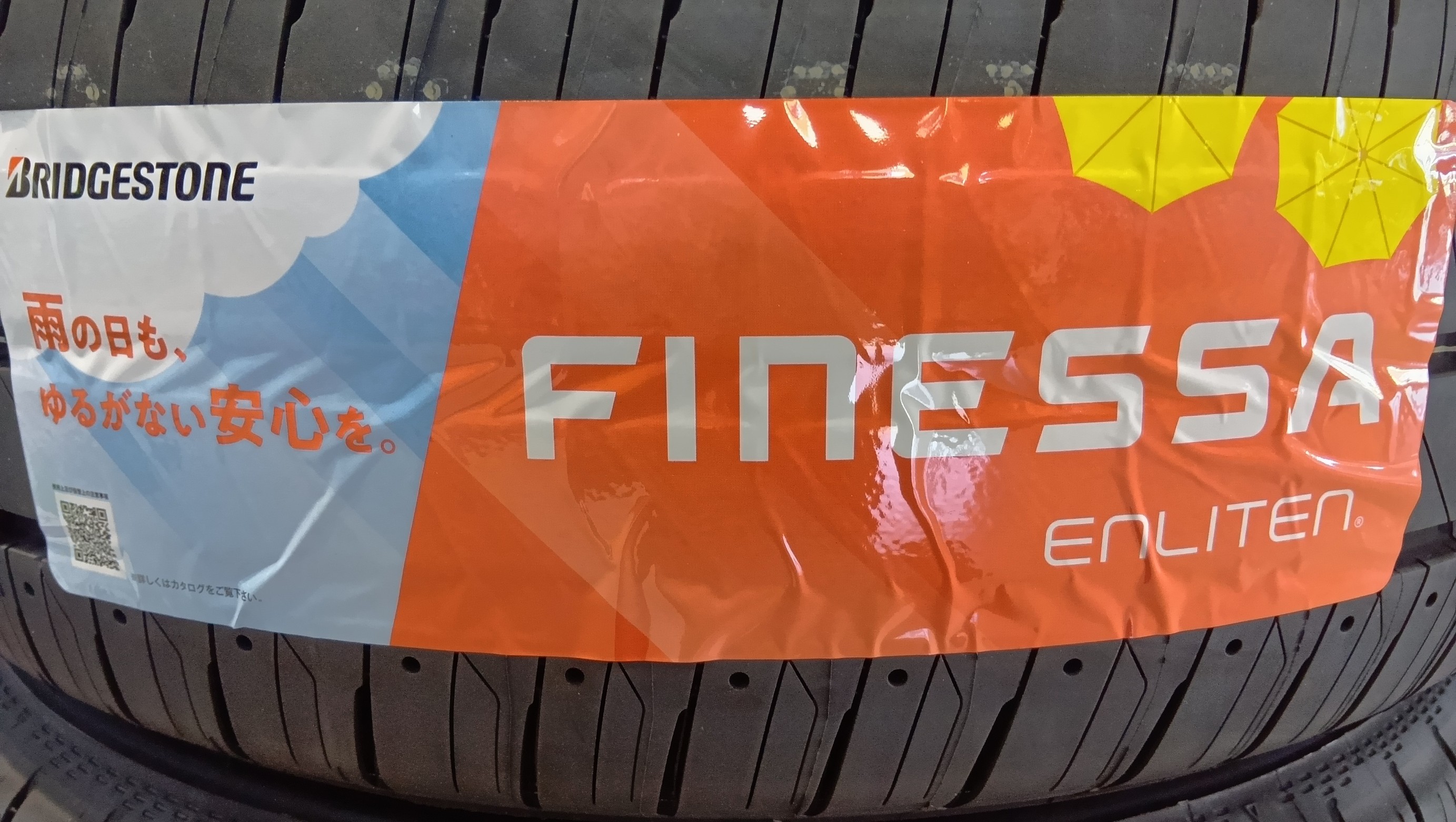 カタログを見ると「雨のち、フィネッサ」そしてタイヤラベルにも「雨の日も、ゆるがない安心を」