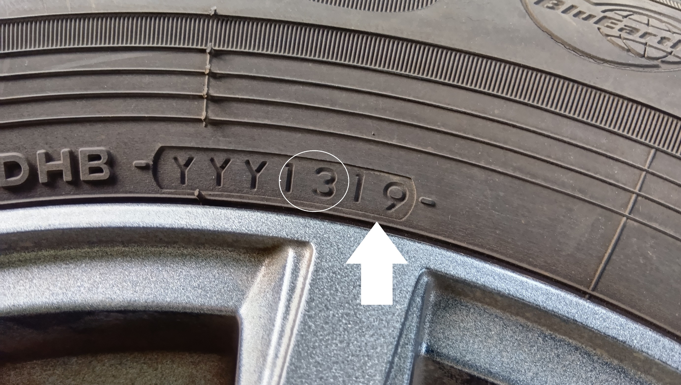 タイヤサイドに1319と刻印が有ります、下二桁(白の矢印)は西暦の下二桁を意味します