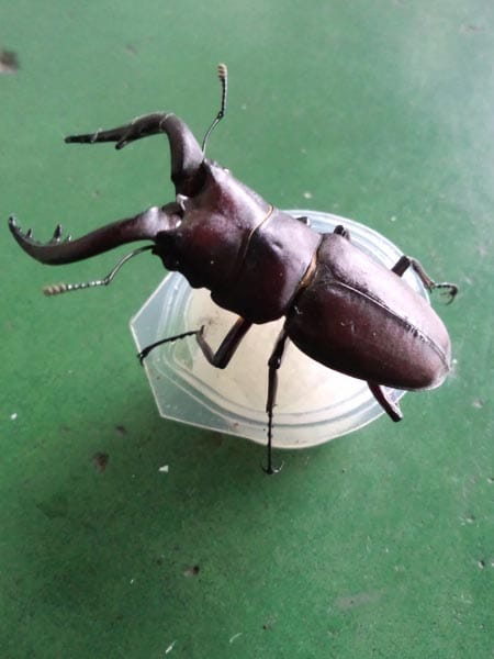 ある日、お店の正面を開けると、なんとノコギリクワガタ君がいるでわありませんか、