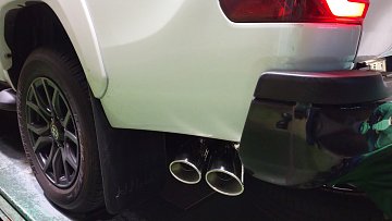 こんにちは、本日は8月7日(水)定休日です ご注意ください さて、今回はトヨタのハイラックスのマフラー交換です 交換させて頂いたマフラーはガナドールです 特徴的なサイドレイアウトによりトレーラーなど牽引物に 排ガスが直接かかりにくく、テールエンドの形状を鋭角にすることで ボディー側...