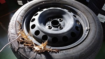 パンク修理にて依頼の画像です タイヤとホイールの隙間に大量の木片が挟まってます 走行中に倒木を避けようとしたが間に合わず フロントタイヤにヒットしてしまったみたいです 道路には予期せぬ物が落ちてる事があります 注意して運転しましょう。