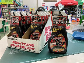 こんにちは!今日はおすすめ商品を紹介いたします 今回紹介する商品はこちらです ブリヂストン タイヤワックス 当店でも人気商品のタイヤワックスです 自然な黒艶! 驚きの耐久性! 安心のタイヤメーカー製! お電話でお問い合わせを頂くことも有る一品です 是非一度お試しください!