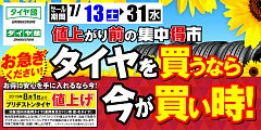 こんにちは、今週末(7/13~)セールを開催します 8/1よりタイヤの値上げが予定されています、更に増税も控えています タイヤ交換をご検討されてるお客様は、増税・値上げ前に ご購入・ご予約されるとお得ですよ 皆様のご来店お待ちしております。 尚、当店は水曜日が定休日になります ご来店の...