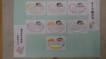 先日、近隣の小学校で毎年恒例の「町たんけん」がありました タイヤ館にも2年生が数名来店してスタッフにインタビューしたり お店を見学したりしてました。 その時の生徒のお礼のメッセージを先生が届けてくれました カラフルな心温まる温かいメッセージです、 しばらくはスタッフルームに飾ってお...