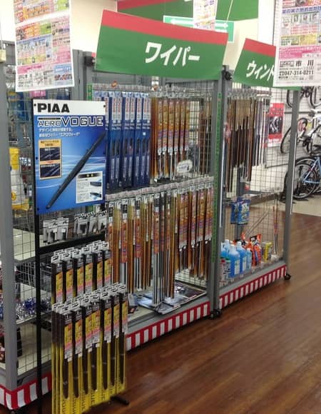本日はワイパーコーナーを紹介、当店は多種類のゴム、ブレードをご用意!