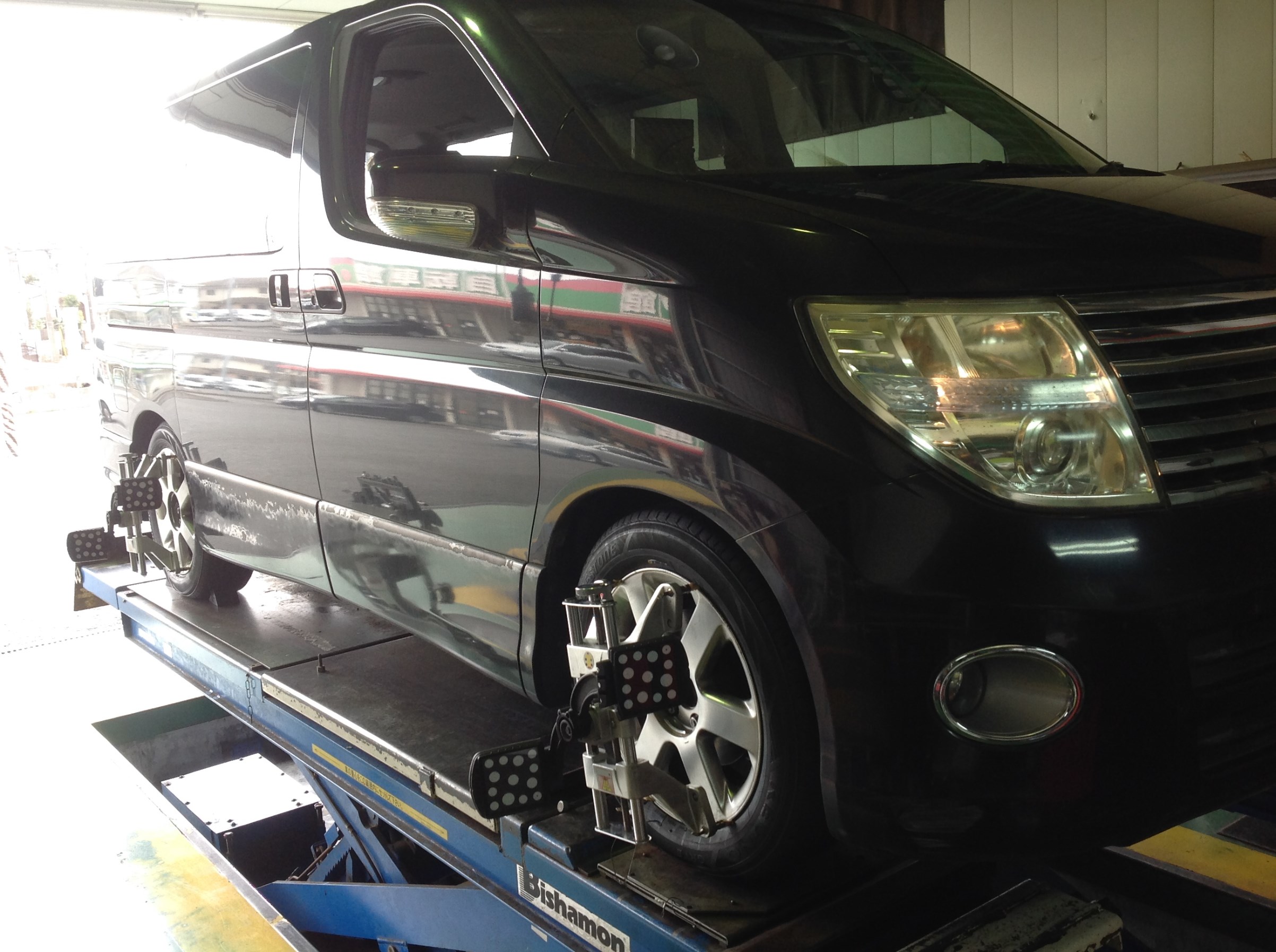 本日はエルグランドのタイヤ交換、アライメント調整、バッテリー交換を実施。