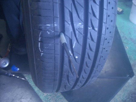 空気圧点検でいらしたお客様のタイヤに空気圧低下が見られた為、点検をするとパンクしてました。