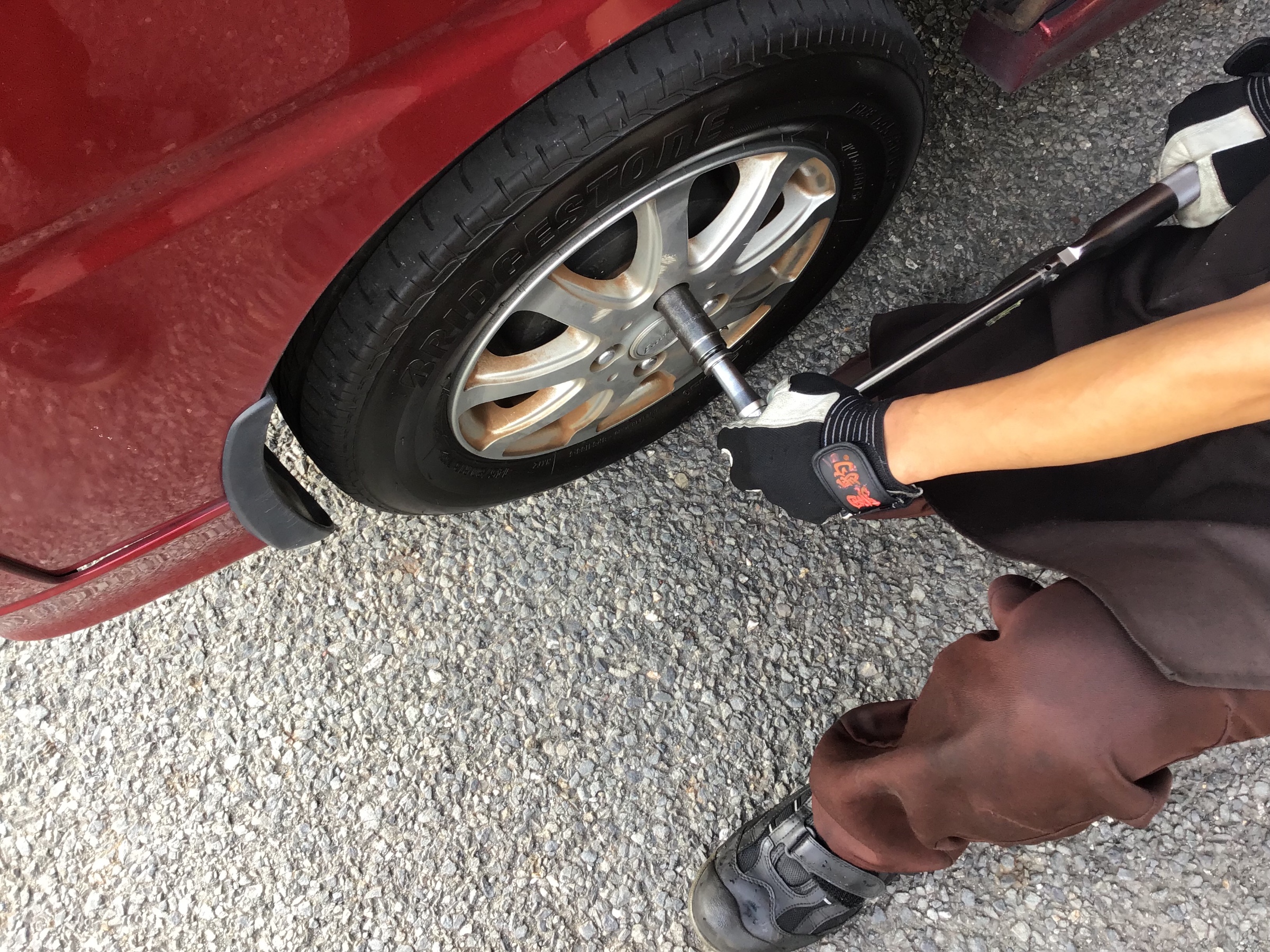 空気圧点検とナットの締め付けを見させていただく大事な作業です。