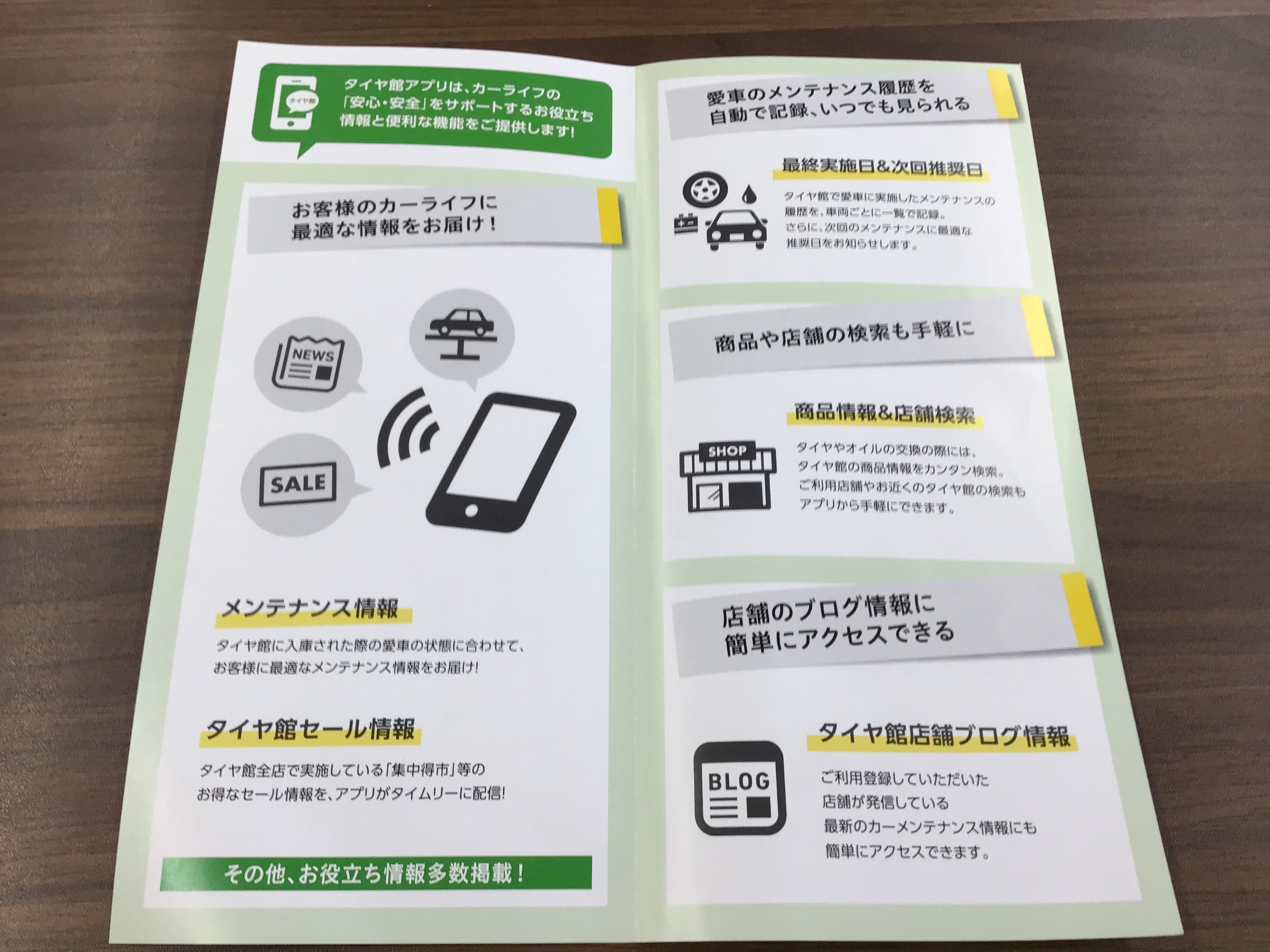 メンテナンスの履歴が自動登録され、いつでも見られます。タイヤ館セールの情報、商品の検索、