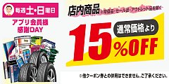 こんにちは、タイヤ館市川店です! 今回もお得な情報お届けします('ω')ノ 明日のクーポンは店内商品15%OFF!! ※特価品・セール品・アウトレット品は対象外になります※ この機会に是非タイヤ館市川店にお越し下さい!