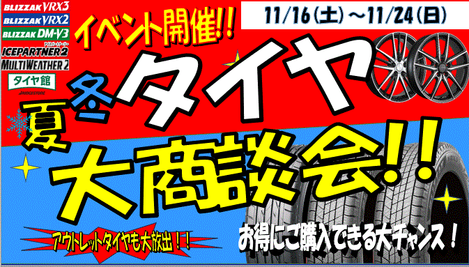 冬の大商談会第2弾 開催予告(*'▽') 2024年11月2日 いつも当店HPをご覧いただきありがとうございます。 昨日の大商談会が好評だったため第2弾を開催することになりました(*'▽') 期間は11月16日(土)から24日(日)になります。 冬タイヤ・夏タイヤ・オールシーズンタイヤ お得にご購入できるチャンスです(*^-^*) たくさんのご来店お待ちしております!